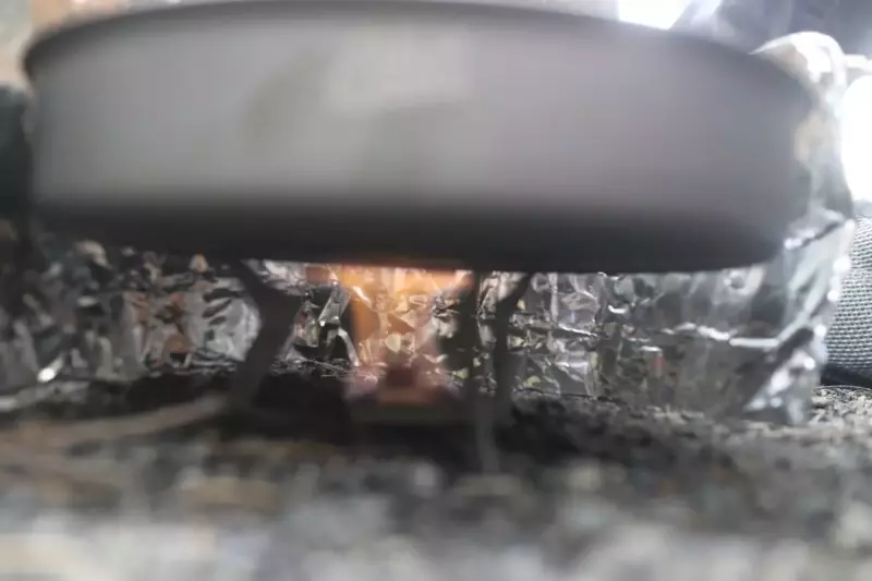 固形燃料を使う時に気を付けているのは、熱が逃げないようにすることです。僕は100均で買ったアルミの天ぷらガードを使って、固形燃料の周りを囲って熱が逃げないようにしています。夏場でも風が強いと熱が逃げてしまって、「この大きさで、これだけの量の水を沸かすことができる」と試算していても、湧かない時もしばしばあります。